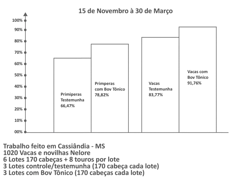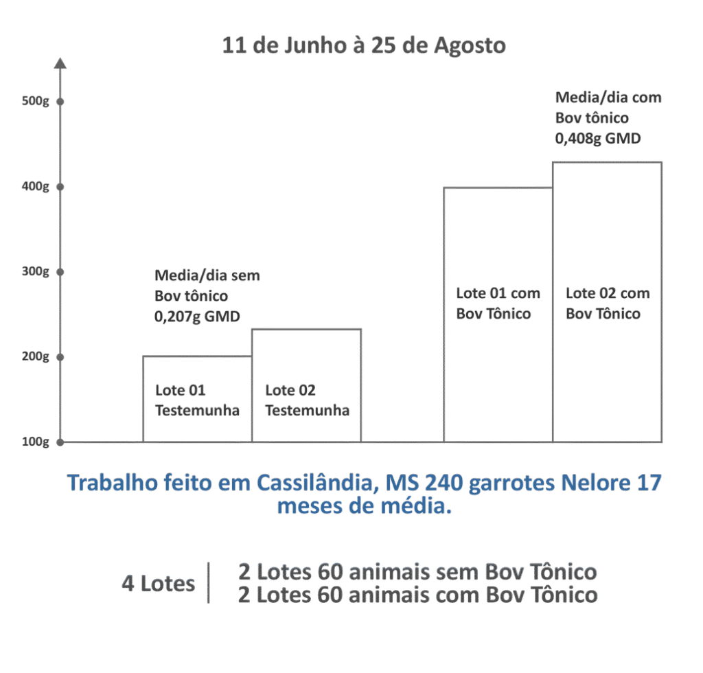 Rebanho em uso: 1400 garrotes de recria – proteinado 0,5%, inclusão de 100 gramas Bov Tônico por ton. de proteinado.